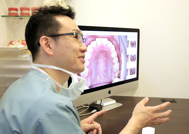 相談時には口腔内の診察を行い、お口の中の写真を撮影し、写真を見ながら歯並びや噛み合わせの問題点と、解決のための治療方法についてご説明します。