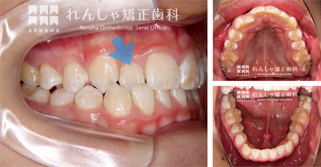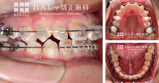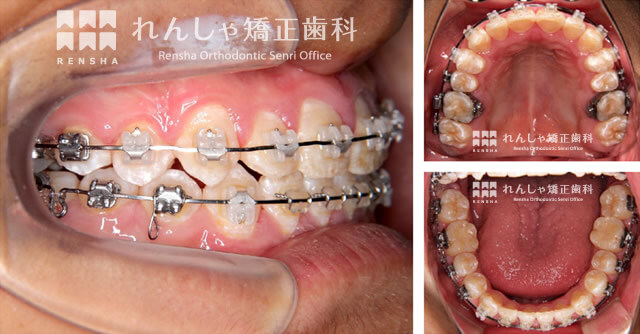 矯正治療開始後、上下歯列に装置を装着して歯並びの調節を行いました。ついで右上2番目のスペースを確保、歯を前方に引っ張り出します。