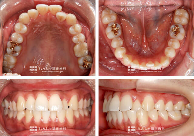 以下の症例写真のように、S.Tさんのがたつきの改善は進んでいます。今後は、残ったスペースを利用して上下前歯を後方へ牽引していく治療を行います。